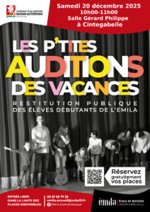 Les petites auditions regroupent les élèves débutants des classes instrumentales de l’EMILA. Vous pouvez réservez vos places via la billeterie.…